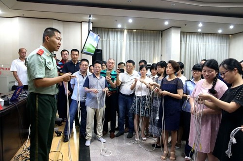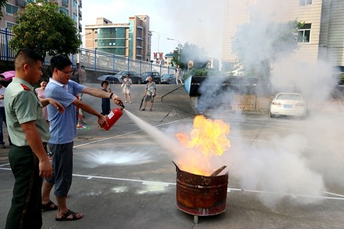 随后,宣传人员模拟市工商局大楼九楼办公室起火,全体职工纷纷用湿毛巾捂住口鼻,弯腰有序地按照既定预案,向室外空旷地带撤离。由于火势不大,单位微型消防站队员仅用灭火器就将初期火灾成功扑灭。除此之外,宣传人员还现场演示了防火毯、灭火器、空气呼吸器的使用方法,对结绳法的打法进行了“手把手”教学,并指导参训人员亲身体验油盆灭火演练,同时耐心解答了职工们关于各类消防设施使用的疑惑。